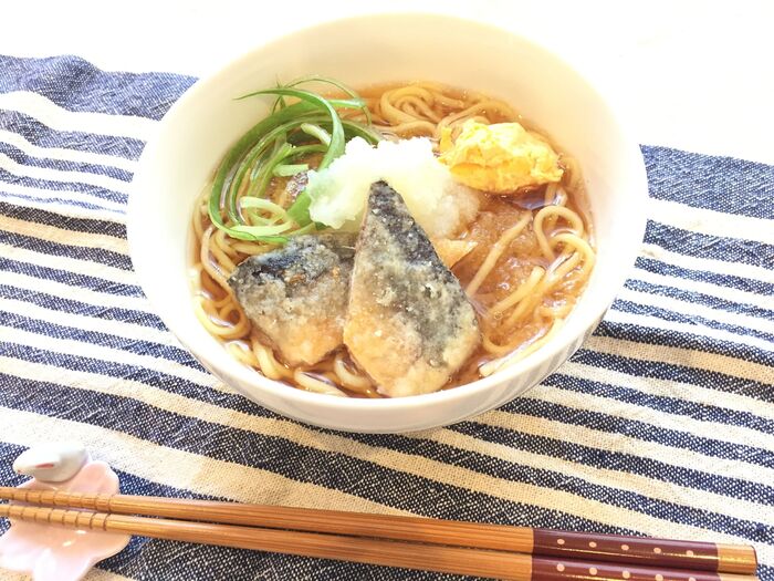盛りつけです。器におろしスープ、麺の順に盛りつけます。秋刀魚のフライ、細切りネギを盛りつけ、最後に器の中央に大根おろしを盛りつけて完成です。