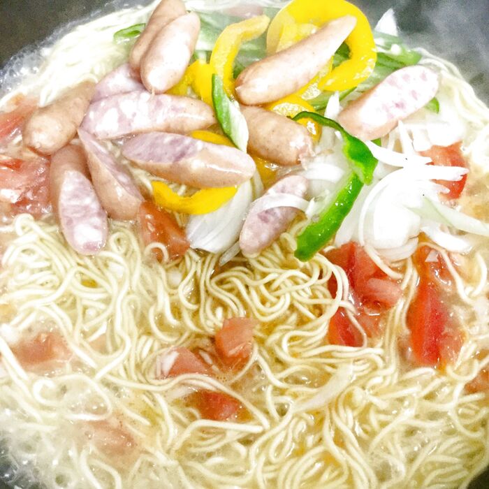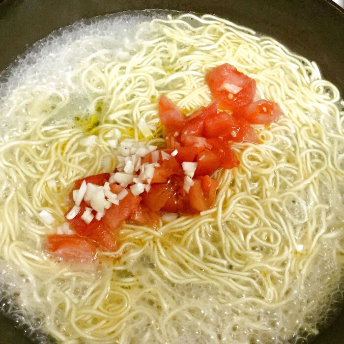 麺がほぐれてきたら、油、にんにくとトマトを加えます。