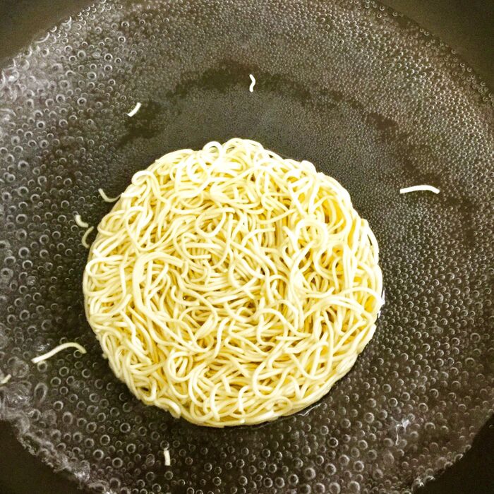 記載されている水(500ccですが、400-500cc程度)を沸かして、麺を茹でます。