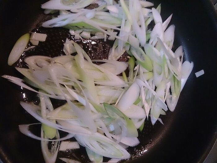 ニンニクの美味しい匂いがしてきたら、ネギを入れて炒めます。