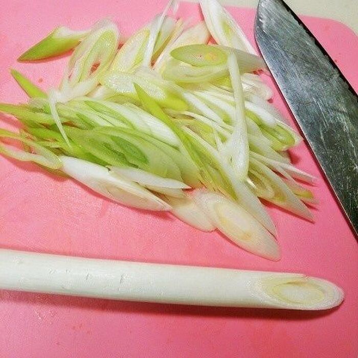 長ネギを斜めに切り、ニンニクはみじん切りにします。