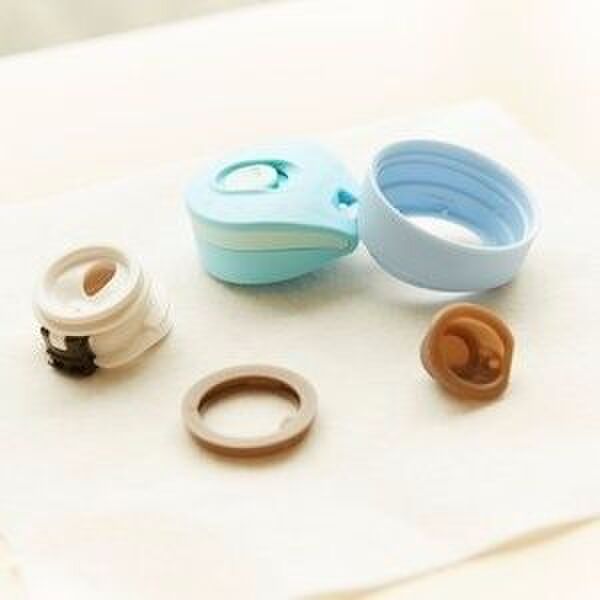 フタ、パッキン、ボディリング、底カバーなどは、プラスチックの容器に所定量の水筒用の酸素系漂白剤を入れて水で溶かし、その中につけおきします。つけおき時間は30分を目安に。終わったら水ですすいでよく水を切り、十分に乾燥させます。