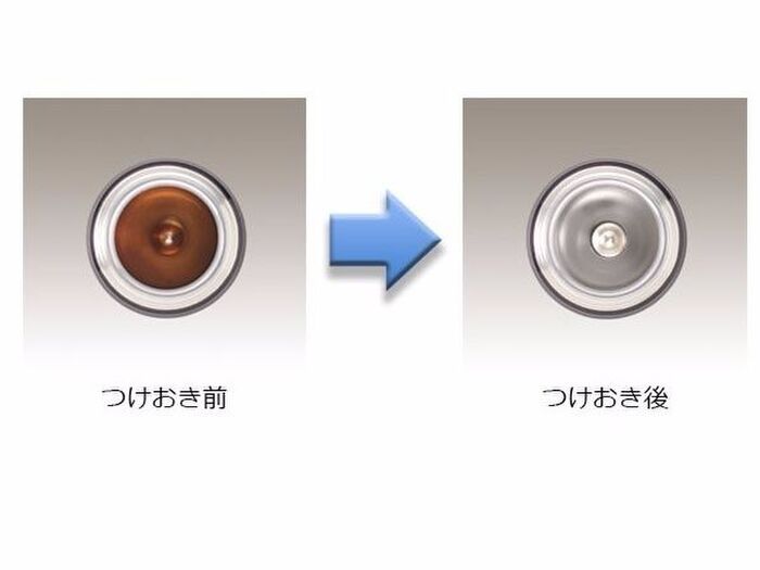 塩素系漂白剤は、ステンレスがさびてしまうおそれがあるので、フタや本体には使用しないこと。また、ボトルの外側の塗装やシールなどがはがれるおそれがあるので、ボトルごとつけおきするのはやめましょう。