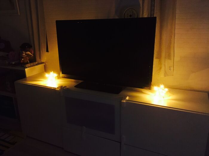 この他、ケーブルをオブジェに固定すれば、吊り下げて飾ることも可能です。今はテレビの両脇に置いて、明かりとオブジェを楽しんでいますが、これからの季節はクリスマス飾りとして、玄関の飾り棚などに飾るのもステキですね。