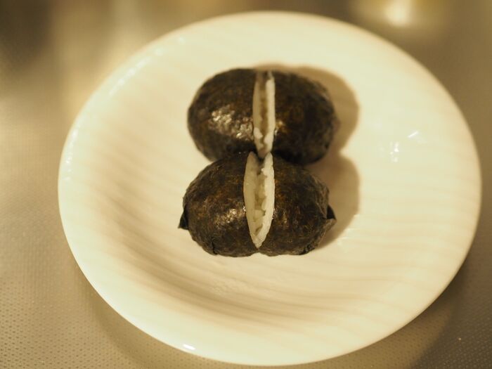2、1の丸めたご飯を焼きのり1/4枚でくるみます。