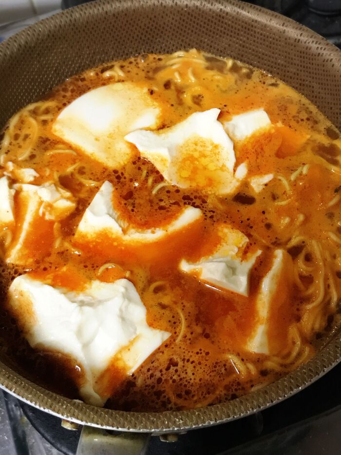 アサリの口が開いたらザルにあげ、鍋のアクを取ります。そこへ乾麺を入れて中火にし4分茹でます。その間に、麺を茹でてる鍋に添付のスープ、にんにく、コチジャンを入れ、豆腐をスプーンですくって入れます。