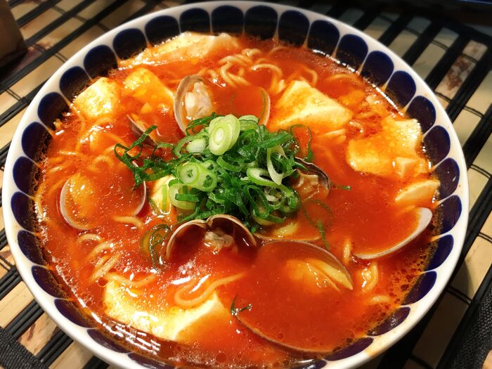具材は今回、アサリとネギだけですが、豚肉や玉ねぎなどを入れても美味しいです。また、卵を入れると少し辛味がまろやかになりますので、お好みでどうぞ♪