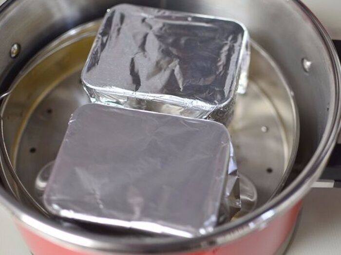 圧力鍋に水を200mlを注ぎ、付属の3脚とすのこを乗せて2を乗せてアルミホイル等で蓋をする。