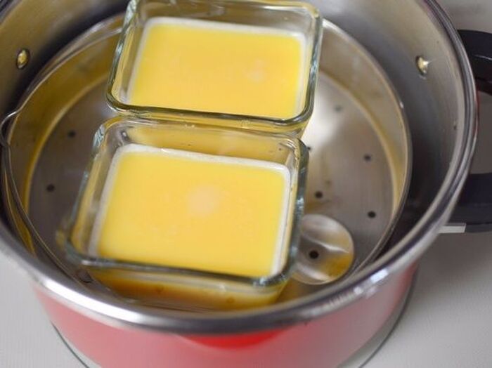 耐熱容器の内側を水でぬらしてから1を流しいれる。(泡がたたないように)