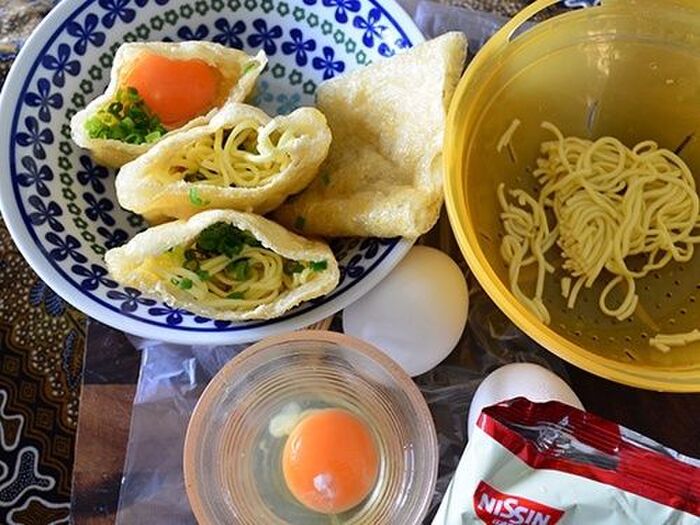 3:油揚げの中に麺、万能ねぎ、卵を割り入れ、楊枝で口を閉じる。