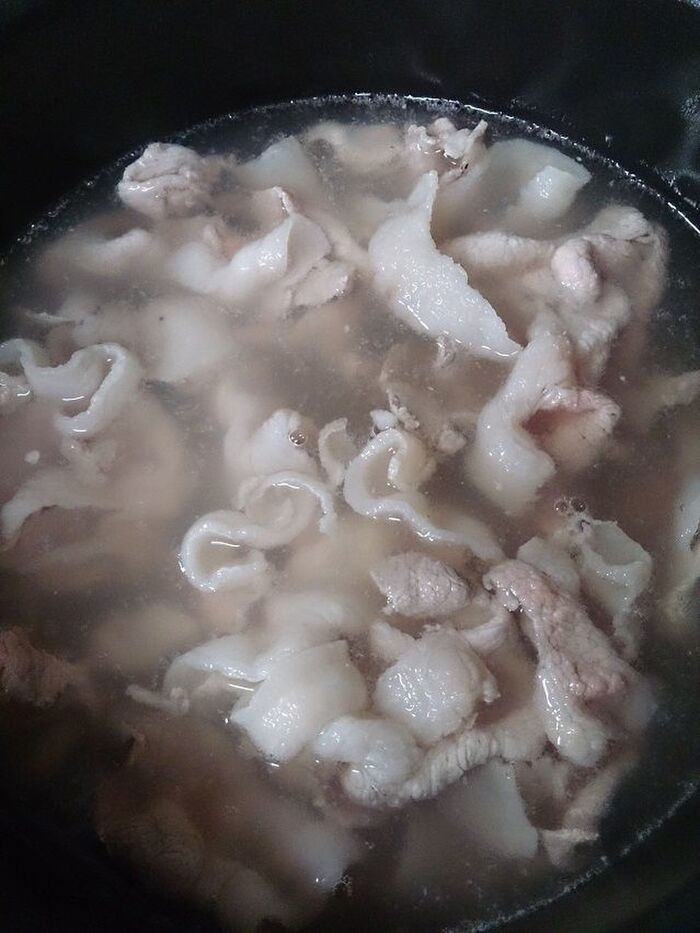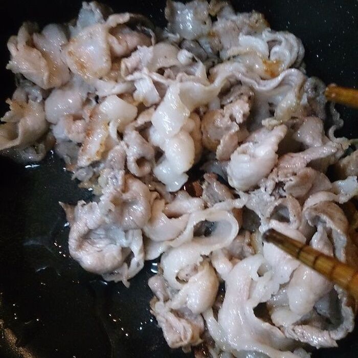 豚小間は、結構油が多いのでこの時期少し時間がたつと脂が固まり始めるので焼く前に少し沸騰したお湯で湯がきます。