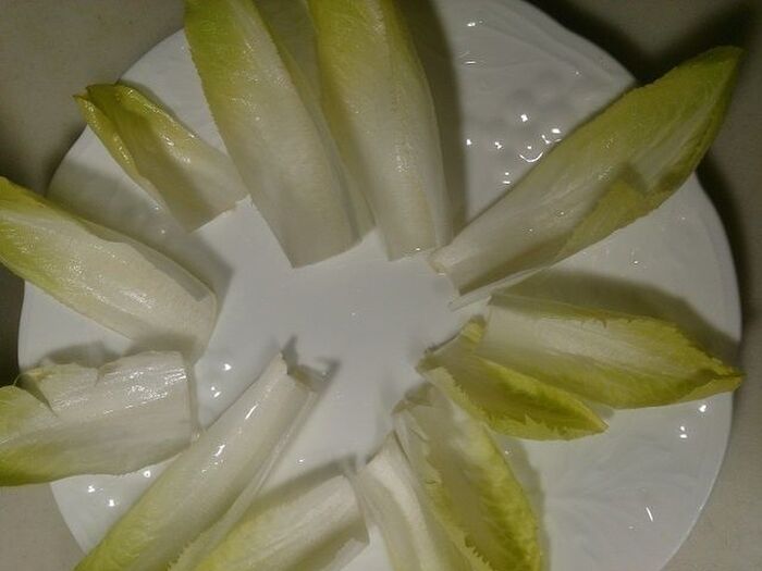 お皿にチコリーをのせて真ん中にカイワレを盛ります。