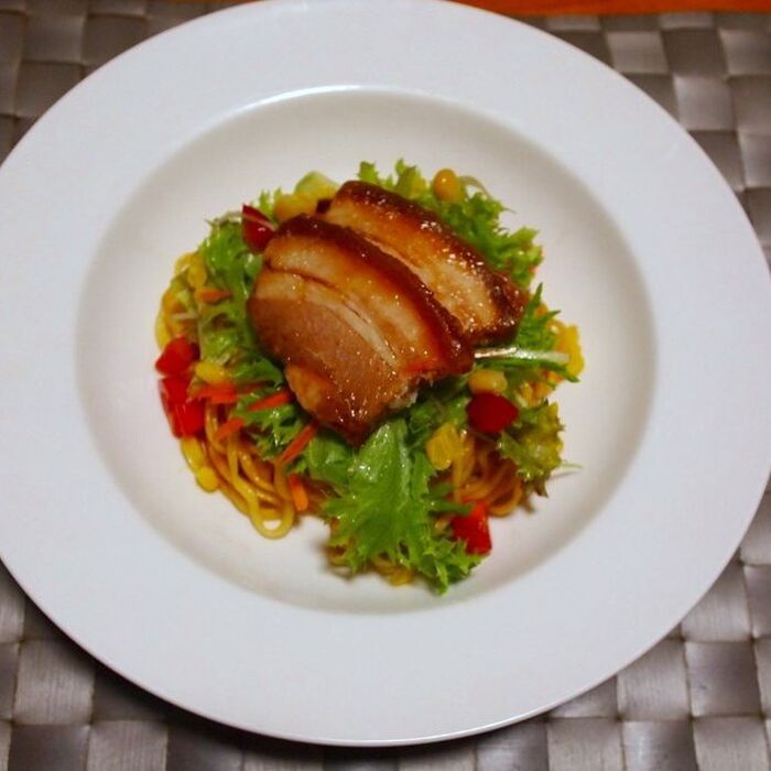 お皿にベビーリーフ→コーン→角切りにしたトマト→チャーシューを乗せて完成です。