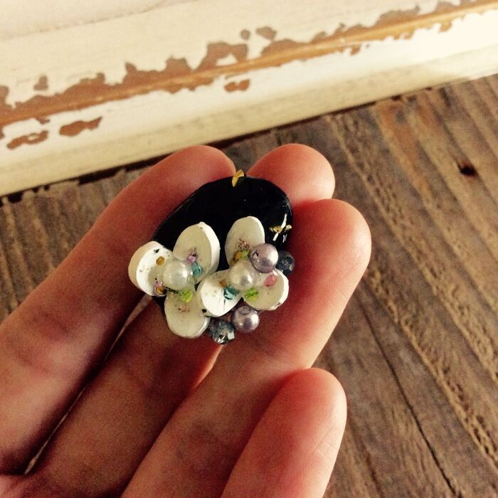 黒マニキュア・パールビーズ・ネイルチップ・レジン液など全てダイソーです。楕円のパーツに黒マニキュアを塗りダイソーネイルチップで爪金具のように3箇所乗せてみました。上からレジン液を流しピンセットで隅々まで行き渡らせます。花パーツは白マニキュアを塗り、真ん中にラメマニキュア・パールビーズを置いてレジン液を流します。黒楕円の上に白花を2つ乗せます。
