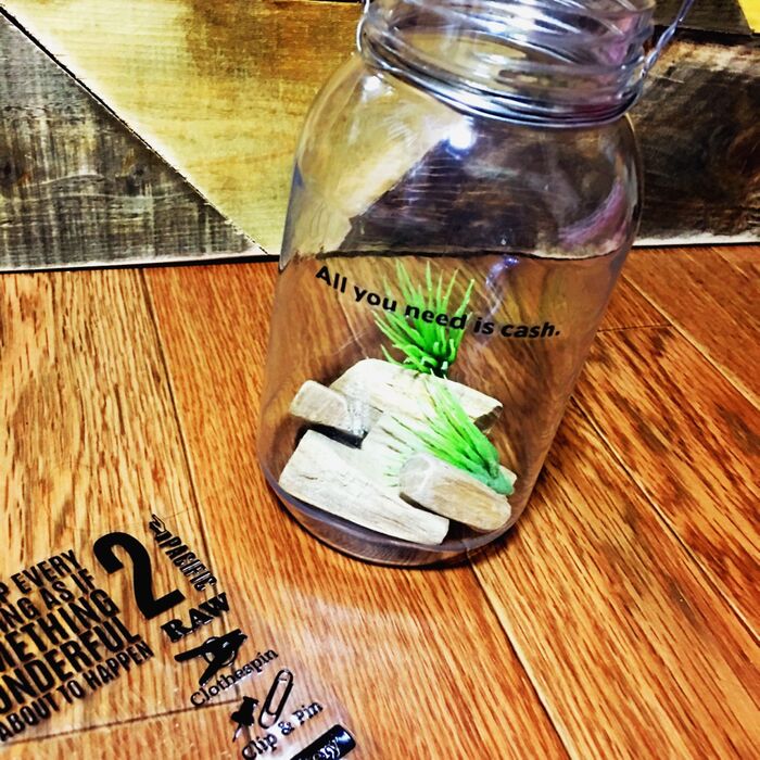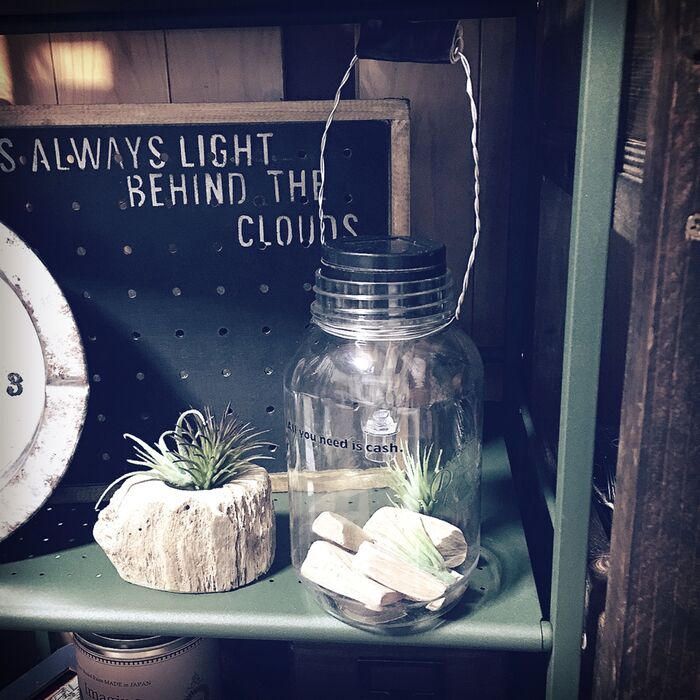 次は中に流木やフェイクグリーン、私はチランジアのフェイクをいれてシンプルに(^-^)ちいさなアニマルさんいれたり、いろいろアレンジは無限大です(^-^)可愛いのが好きな方はドライフラワーなどでもかわいくできるんじゃないでしょうか(^-^)
