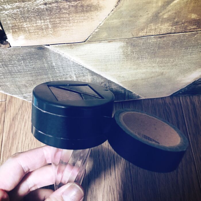 そしてライトが瓶の蓋より気持ちちいさくて抜けちゃう感じなので、黒のマスキングテープでぐるぐるまいて瓶の淵にすっぽりはまるようにします!黒のマスキングテープをつかえばぬったりもしなくて簡単♡