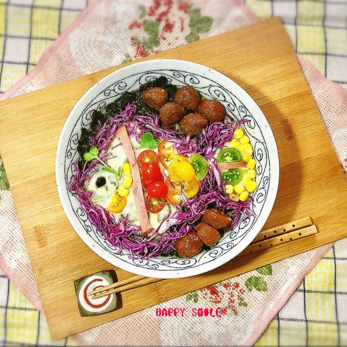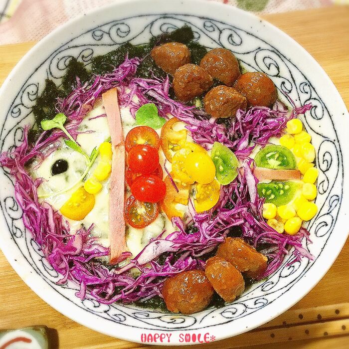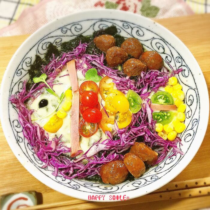 輪郭には紫キャベツ。ミニトマトや焼き豚、コーンはお好きなように飾ります。