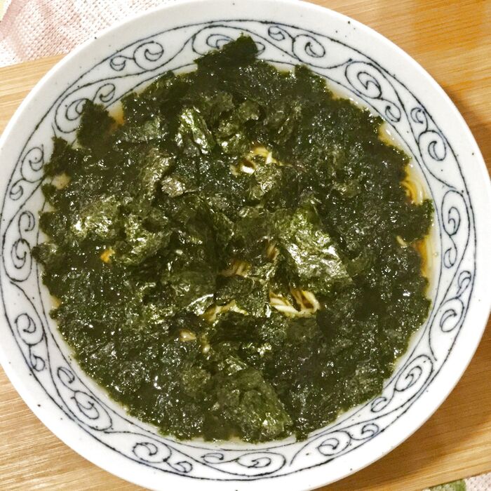 ラーメンを作り器に盛り、焼き海苔で覆います。