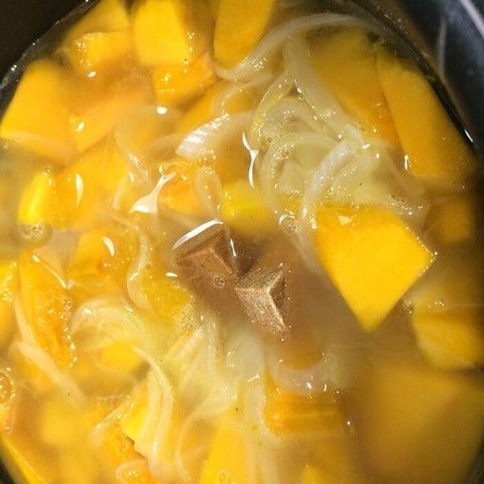 ②かぼちゃも全体に油が回ったら◎を加えてかぼちゃが柔らかくなるまで煮込む