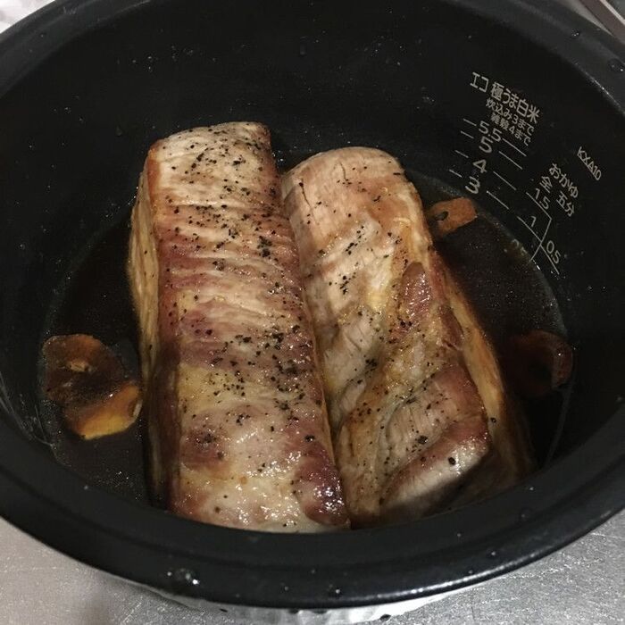 ★マークの調味料とキツネ色のニンニクスライス、全面焼き色が付いたかたまり肉を炊飯器に入れて通常炊飯スイッチオン!
