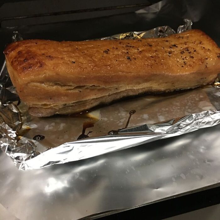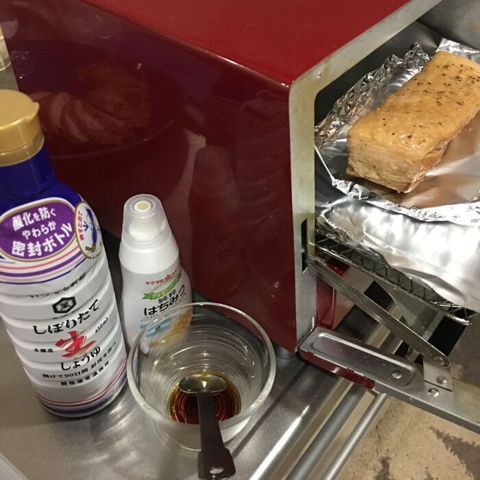 トースターでこんがり焼いて余分な脂をさらに落としてタレを絡めれば美味しい焼豚に^_−☆