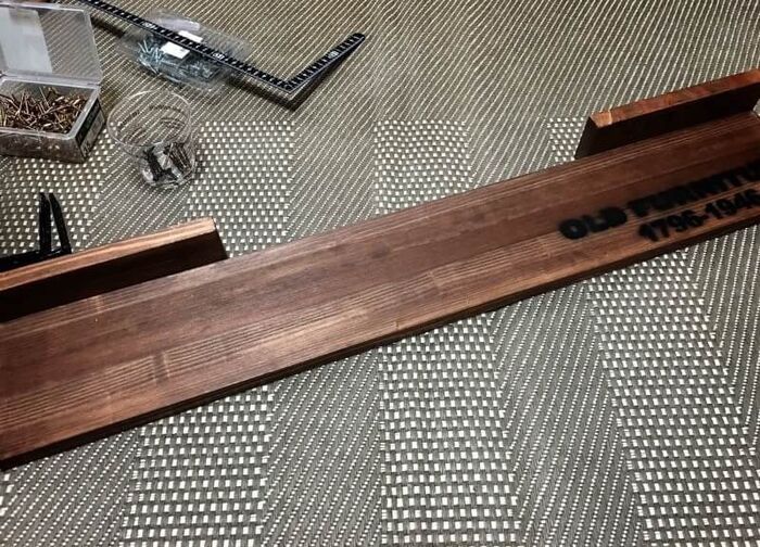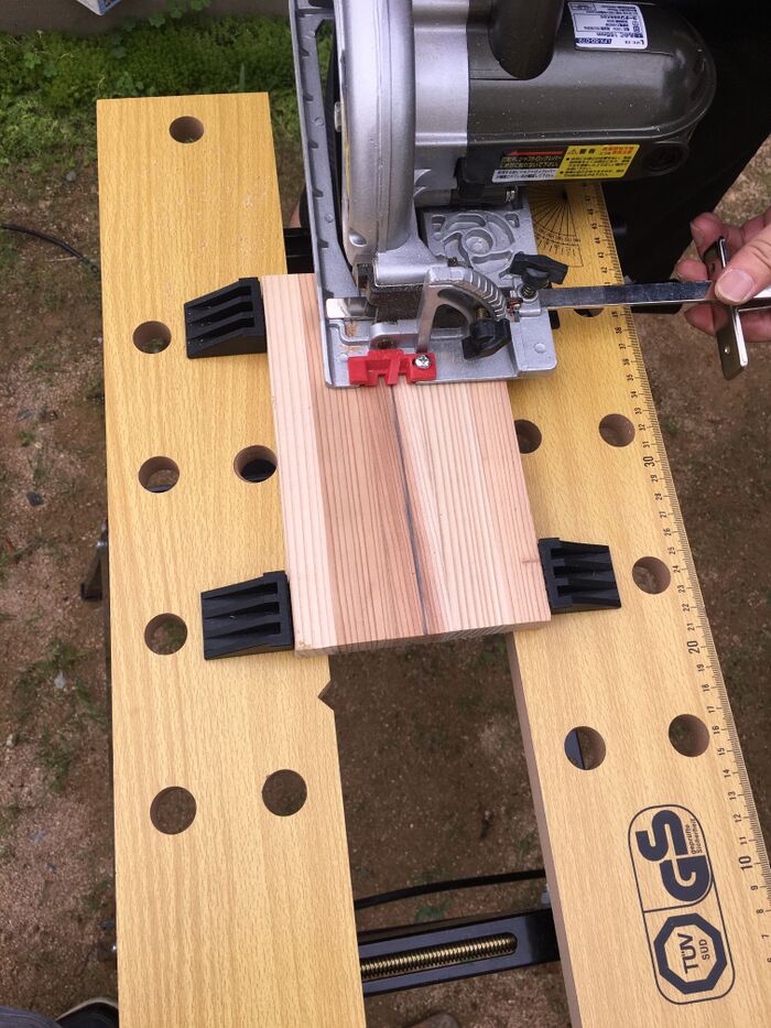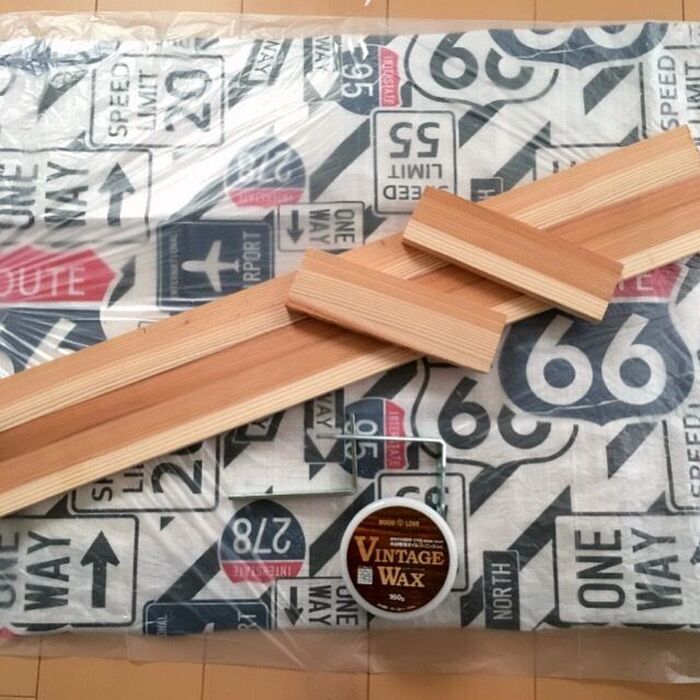 コーナンで見つけた模様入り木材をスピーカーの長さにカットし、短いほうも取り付け用として半分にカットしておきます。