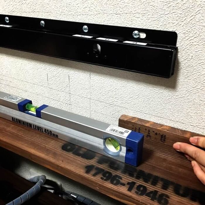 水平器で平行を確認しTVを元に戻して、板を取り付けて出来た隙間に配線を通し隠します。