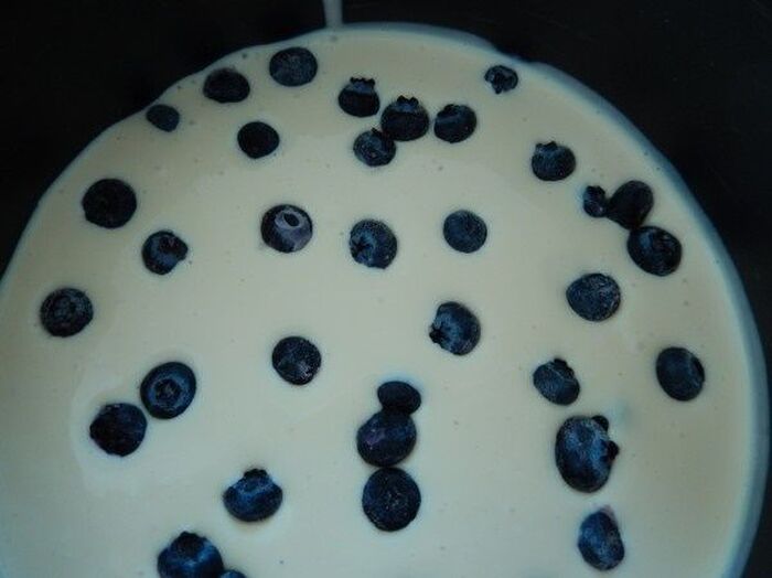 型にブルーベリーをのせ 生地を流し込み 180℃のオーブンで30~40分焼く