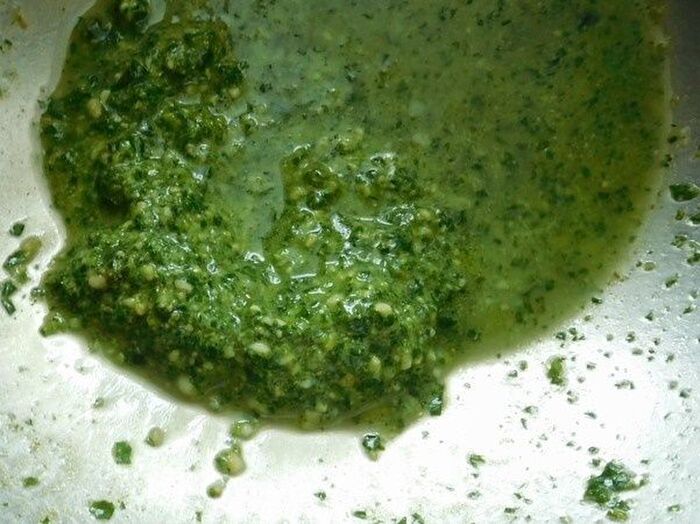 バジリコは鉄に触れると酸化しやすく熱に触れると色と香りが悪くなるので手早くミキサーにかけ加熱しながらでなくボウル等を使ってパスタと和えます。