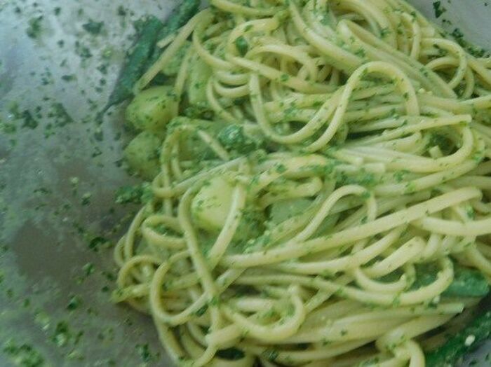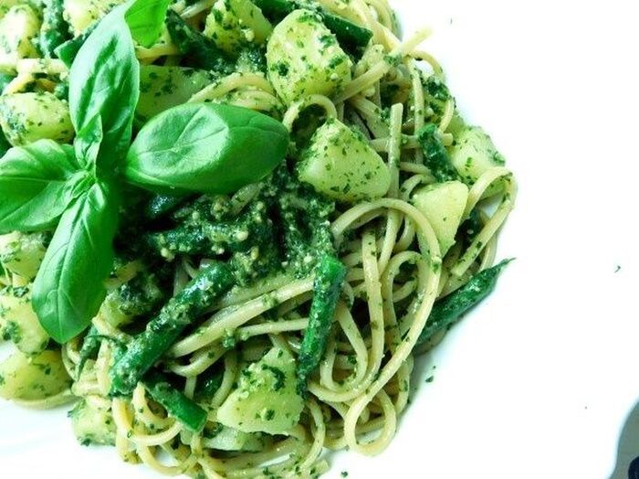 沸騰したお湯でパスタ ジャガイモ インゲンの順で時間差で茹であげ水気をよく切り ボウルにいれソース(一人80g位)とパスタの茹で汁大さじ大さじ4ぐらいを加え手早く和える。