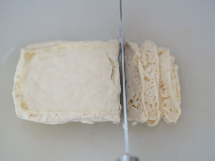 2、1の豆腐を5ミリ程度の薄切りにします。