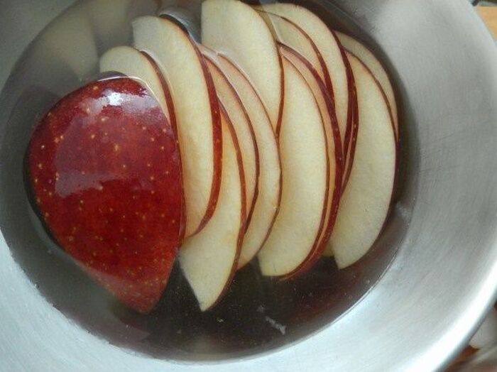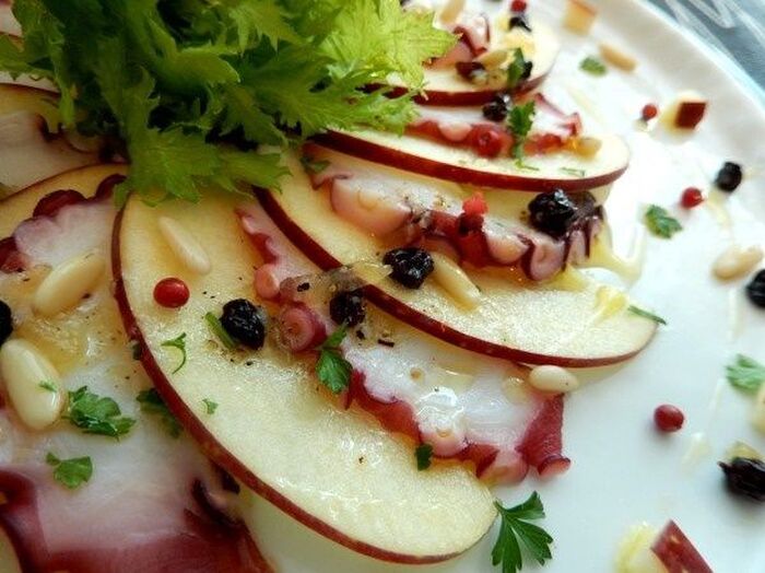 タコは薄切りに りんごは皮付きのまま2mmぐらいの厚さに切り塩水につけておく