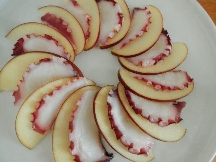 器にりんごとタコを交互に並べる