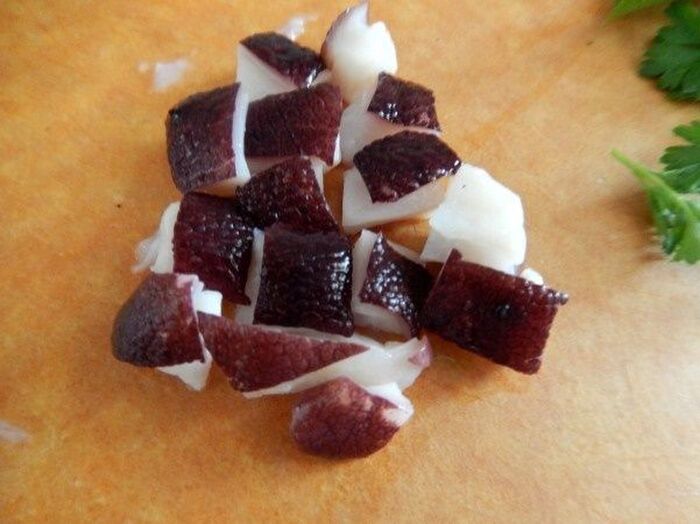 真ん中にタコの頭の部分を適当な大きさに切ったものとわさび菜を盛り付ける