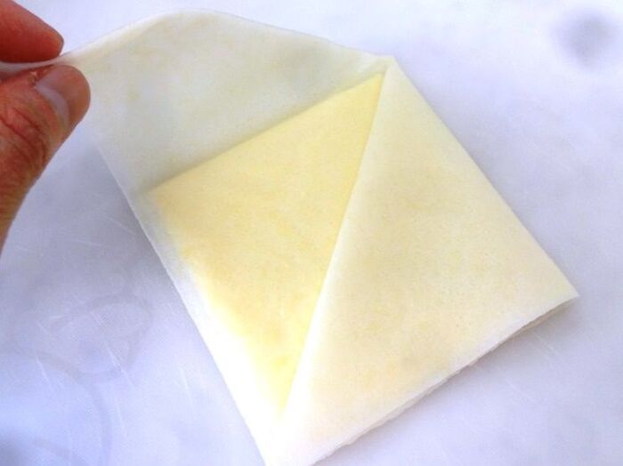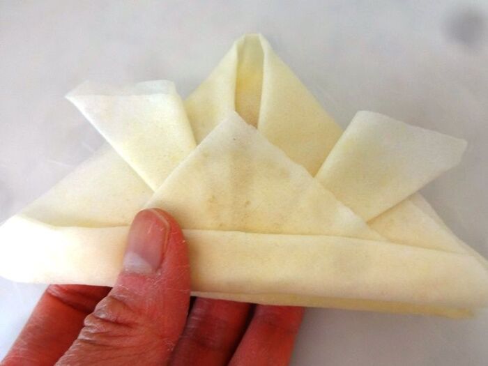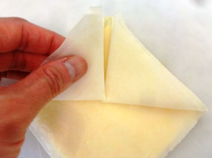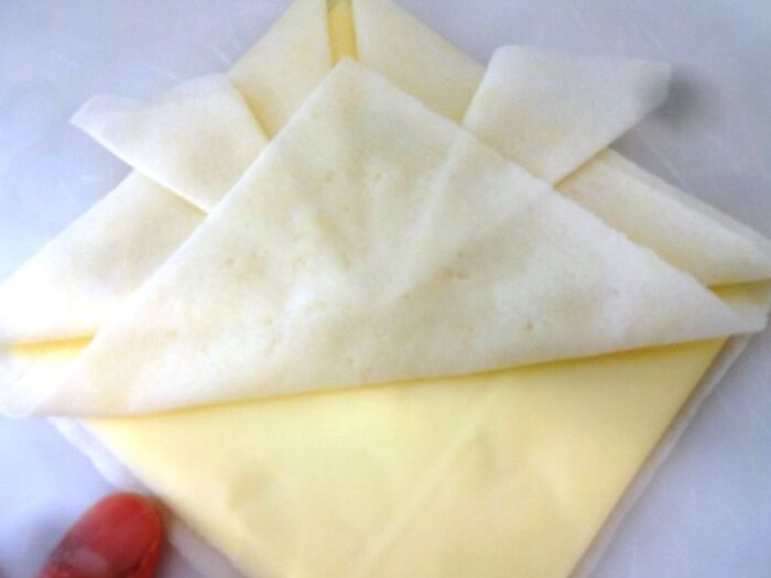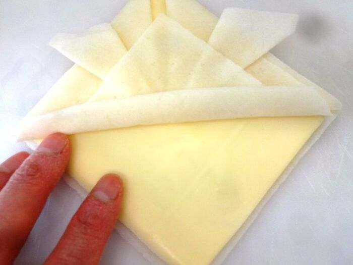 兜型に巻いていく。手前にチーズを置いて,上側を折り,三角にする。