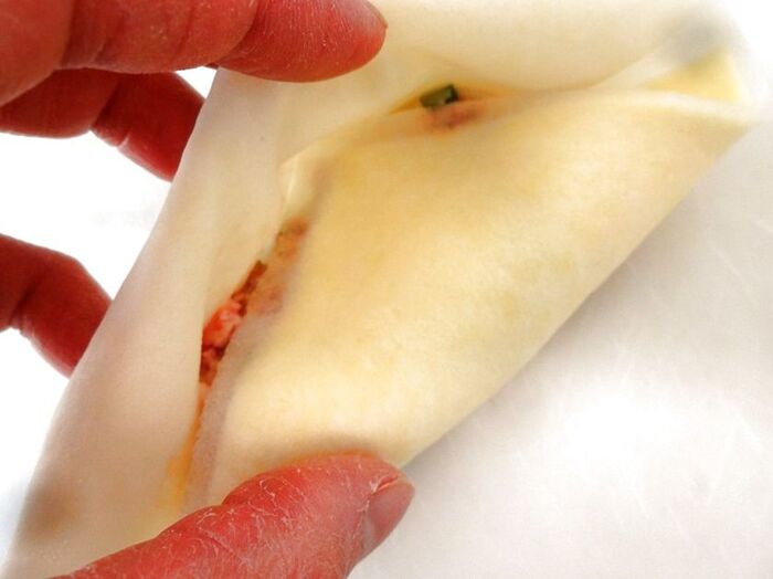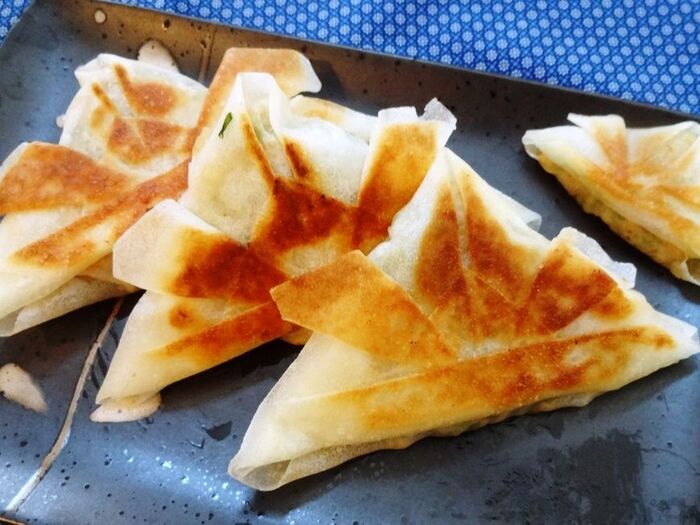 子どもと一緒にできるところが気に入っています。折り紙を折るようにして,春巻きの皮を折ります(^^)