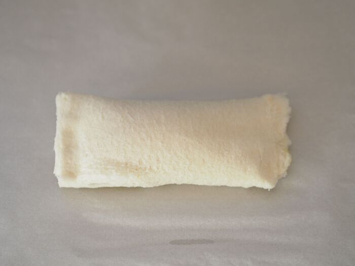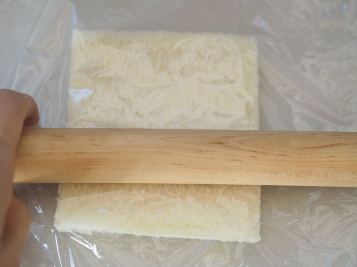 食パンの耳を切り落としてクッキングシートの上にのせ、ラップをかぶせたらその上から麺棒などでのばします。