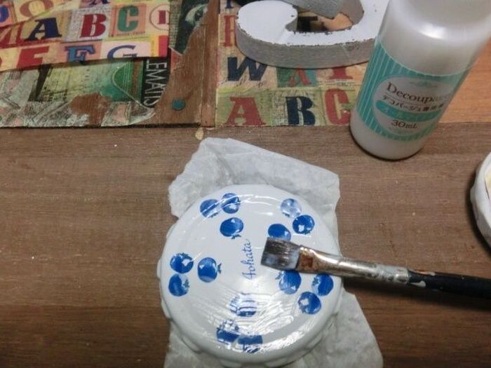 その上から、デコパージュ液を重ね塗りしていきました。(テカテカになってきます。)