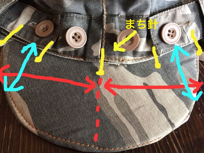 中心をあわせたら、同色の矢印が同じ長さになるように合わせてまち針で留めます。
