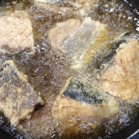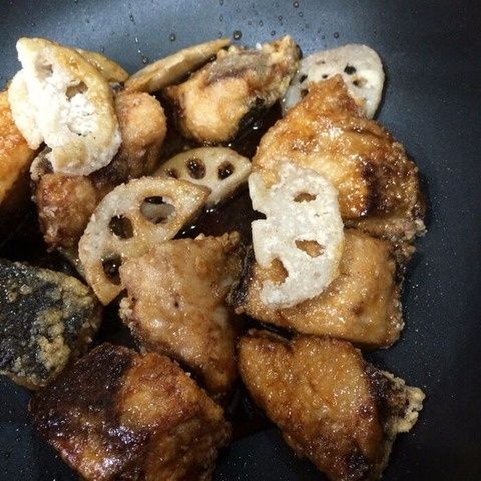 ④れんこんとぶりを順番にあぶらで揚げていきます。