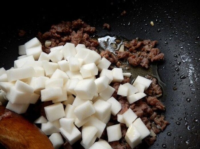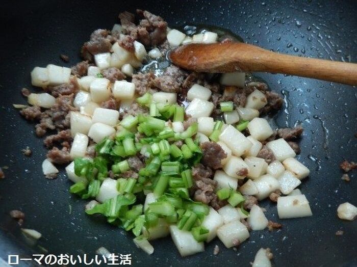 フライパンにオイルを入れ ほぐしたサルシッチャと白ワインを加えじっくり炒め 小さめの角切りにしたカブを加える。