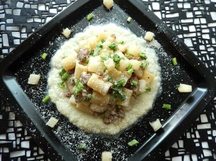 aのソース用のカブと玉ねぎを薄く切りオイルで炒めひたひたの水を入れ煮てからピュレ状にし塩・コショウで味を調える