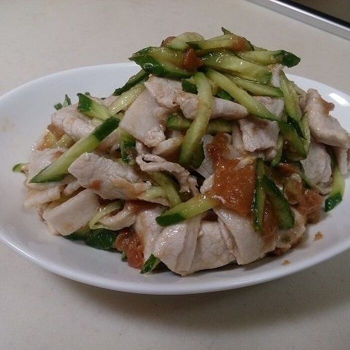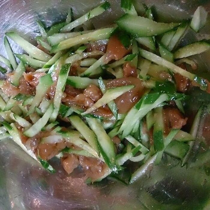梅干しをほぐし、千切りにしたキュウリと軽く和えます。