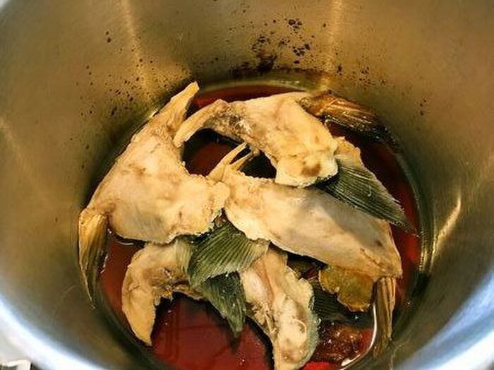 かまを流水で洗い、熱湯でさっと茹でて臭みを抜きます。ざるにあげて水けをきっておきます。