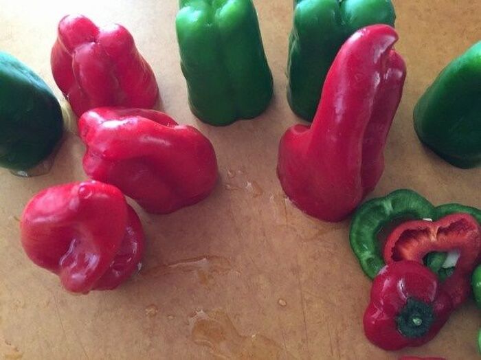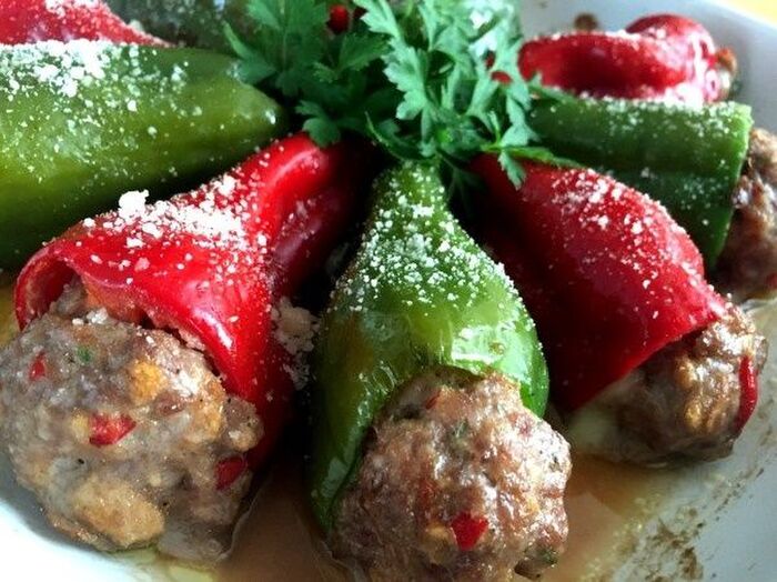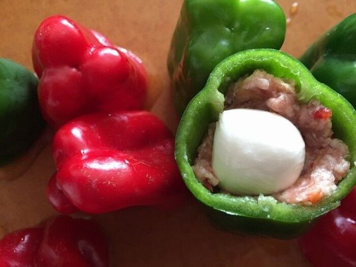 ピーマンに肉を詰めモッツァレッラを押し込み肉で蓋をする