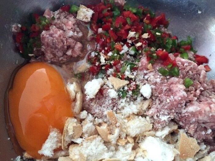 ボウルに肉を入れ塩・コショウ・をふりよく練ってから卵 砕いたお麩 ナツメグ少々刻んだピーマンを加え混ぜ合わせる
