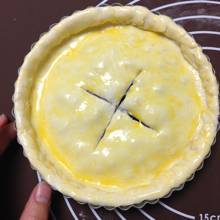 ⑥もう一枚のパイシートで蓋をし、型の縁から1cmくらい大きめに周囲をキッチンバサミで切ります。端を中に折り込むようにして形を作り、包丁で中心を十文字に切り込みを入れて、溶き卵を塗ります。