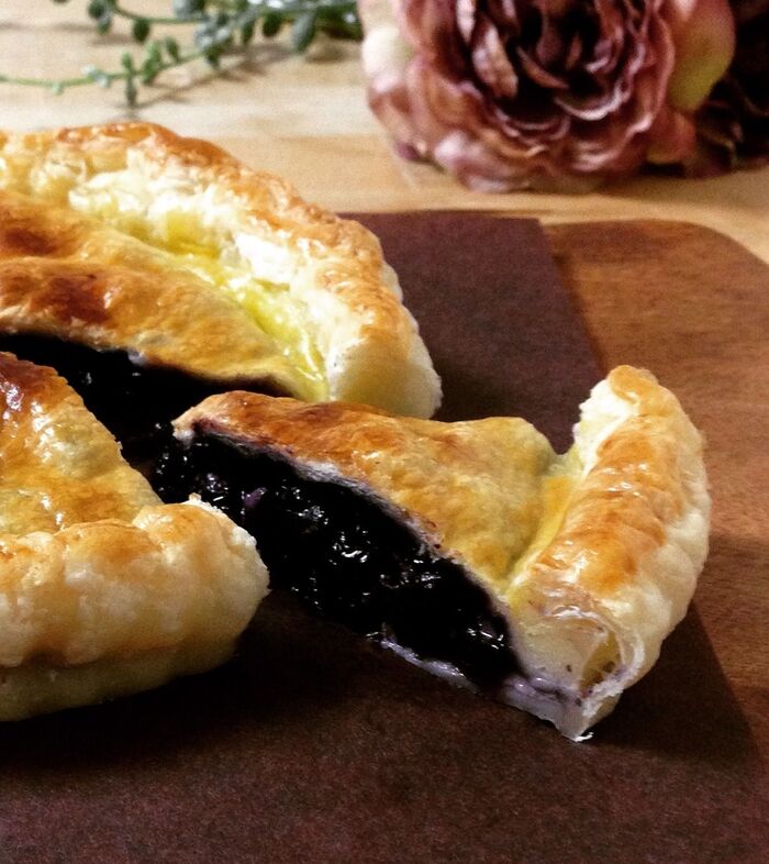 *パイシートを切って残った端は、溶き卵をサッと塗ってグラニュー糖/適量をふりかけ 200℃のオーブンで12~15分くらい焼けばシュガーパイに♪コレもお楽しみの一つです。