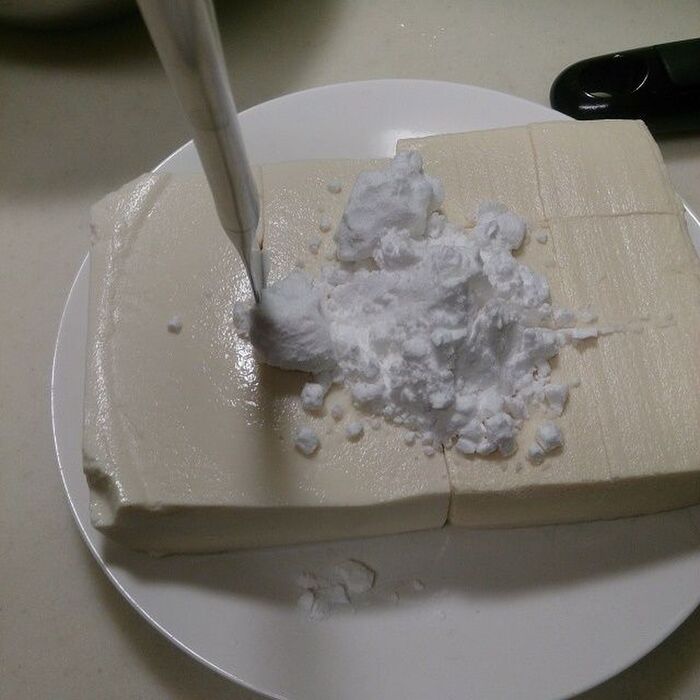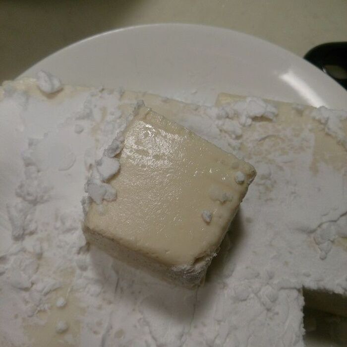ナイフで豆腐を切り 片栗粉を豆腐の上に
