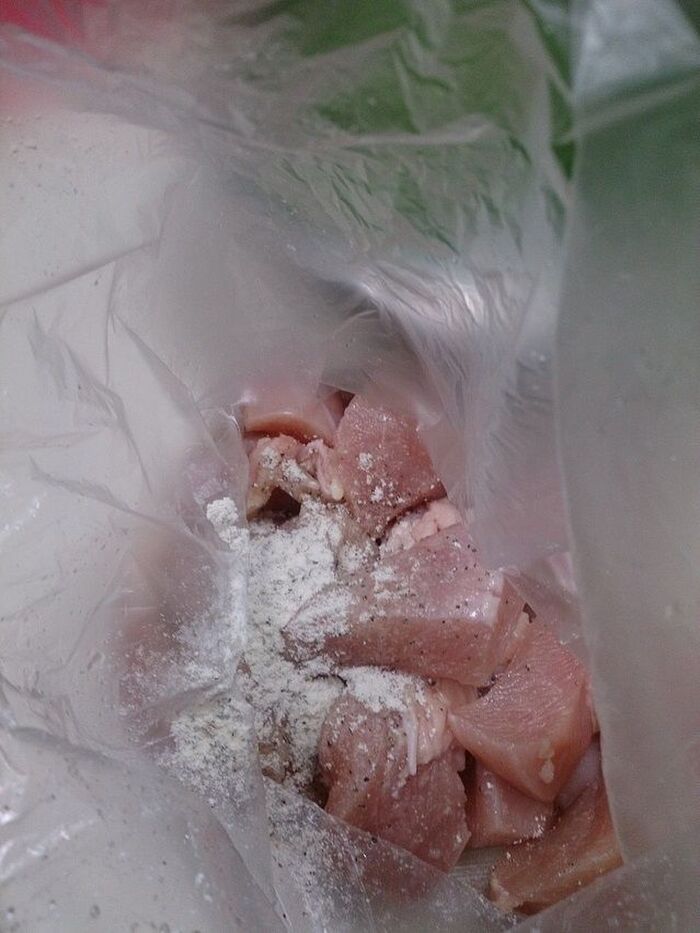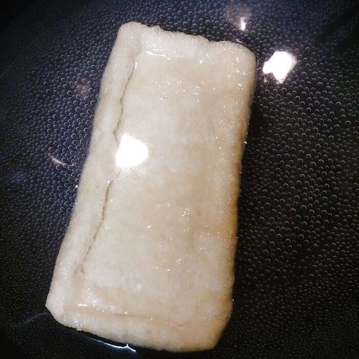豆腐の上で 片栗粉を付けては フライパンの中に